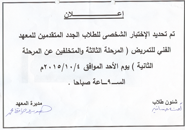 اعلان هام للطلاب الجدد المتقدمين للمدرسة الثانوية الفنية  لمساعدى الخدمات الصحية