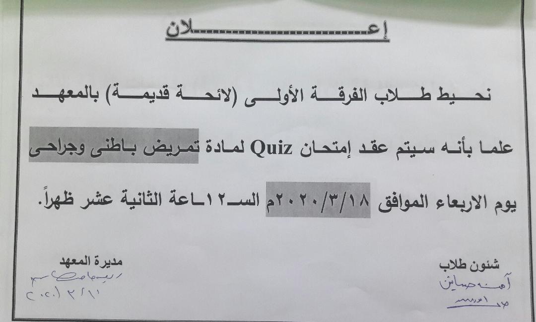 امتحان تمريض باطنى وجراحى لطلاب الفرقة الأولى لائحة قديمة