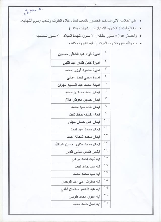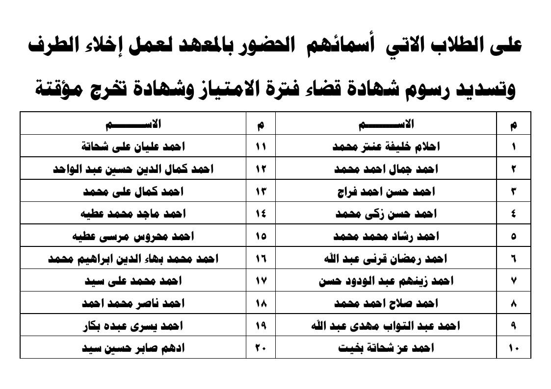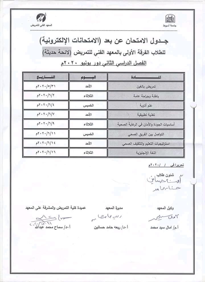 جدول امتحانات الفرقة الأولى بالمعهد (لائحة حديثة)