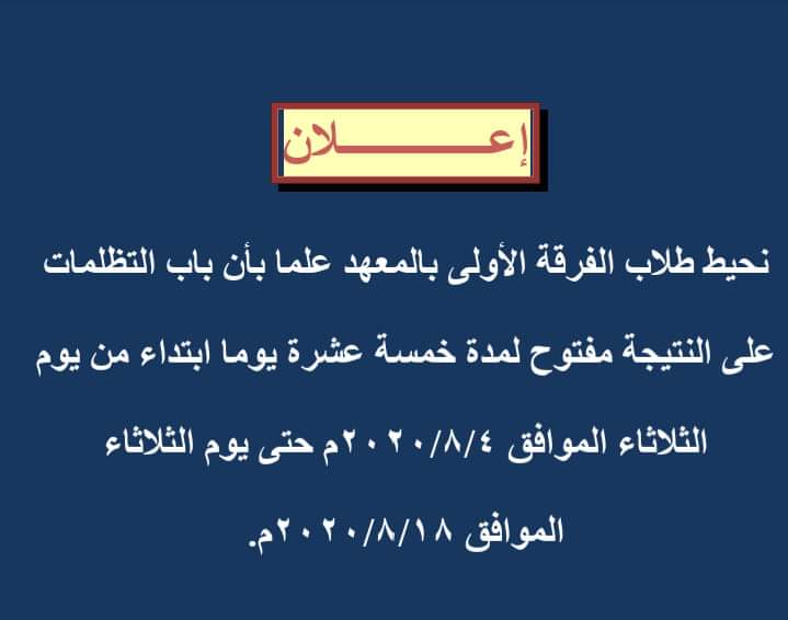 تظلمات الفرقة الأولى بالمعهد Read more about تظلمات الفرقة الأولى بالمعهد تظلمات الفرقة الأولى بالمعهد 18 أغسطس 2020