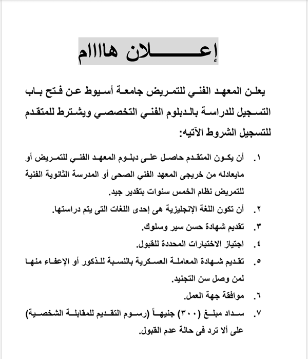 اعلان عن امتحان اعمال السنه لمادة اللغة الانجليزية للفرقة الاولى بالمعهد