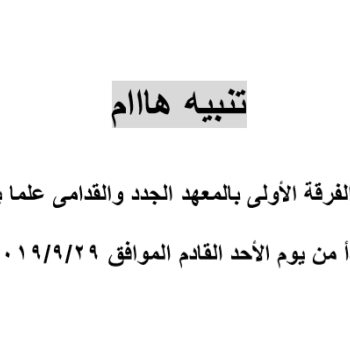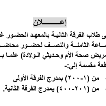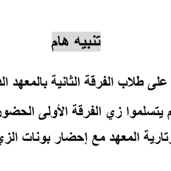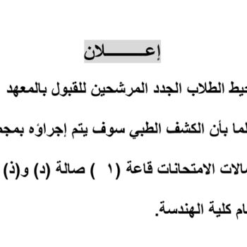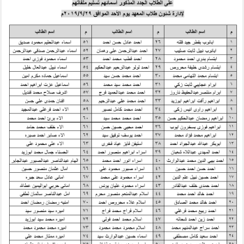 الطلاب الجدد المذكور اسمائهم تسليم ملفاتهم لإدارة شئون طلاب المعهد يوم الأحد الموافق
