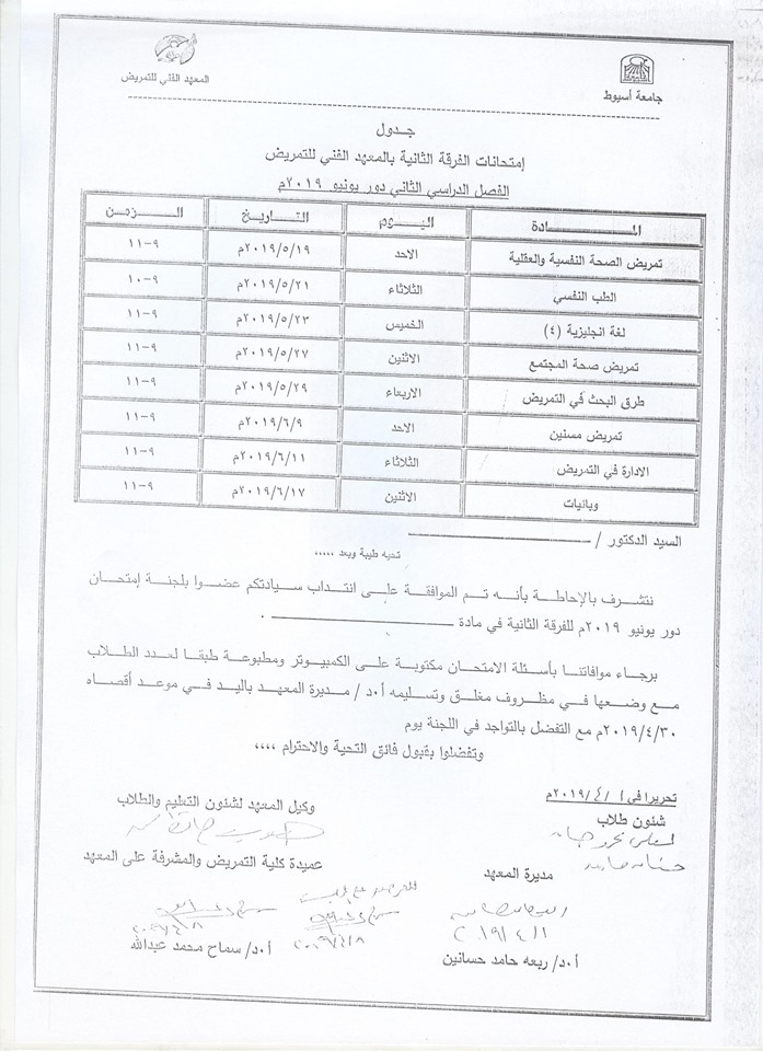جدول إمتحانات الفرقة الثانية بالمعهد