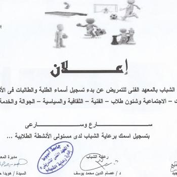 تعلن رعاية الشباب عن بدء تسجيل أسماء الطلاب فى جميع الأنشطة