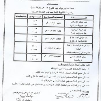 جداول امتحانات دور يوليو ( دور ثانى ) 2015/2016 للفرقة الثانية بالمدرسة الثانوية الفنية لمساعدى الخدمات الصحية