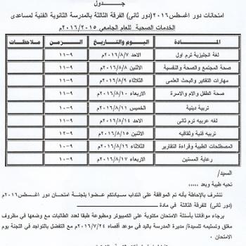 جداول امتحانات دور أغسطس ( دور ثانى ) 2015/2016 للفرقة الثالثة بالمدرسة الثانوية الفنية لمساعدى الخدمات الصحية