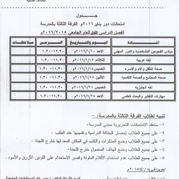 جدول امتحانات دو يناير 2016م للفرقة الثالثة بالمدرسة الثانوية الفنية لمساعدى الخدمات الصحية