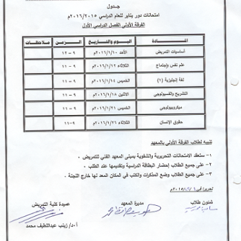 جدول امتحانات دور يناير2015/2016 الفصل الدراسى الأول للفرقة الاولى بالمعهد