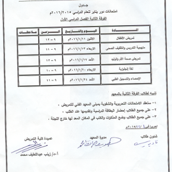جدول امتحانات دور يناير2015/2016 الفصل الدراسى الأول للفرقة الثانية بالمعهد