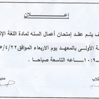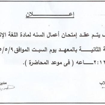 اعلان عن امتحان اعمال السنه لمادة اللغة الانجليزية للفرقة الاولى بالمعهد