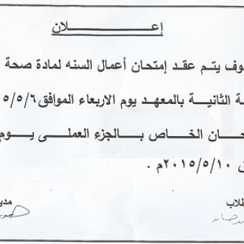 اعلان عن امتحان اعمال السنة لمادة صحة المجتمع للفرقة الثانية بالمعهد