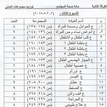 توزيع مجموعات العملى لمادة صحة المجتمع الفرقة الثانية