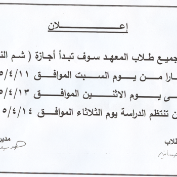 سوف يعقد امتحان الميدترم لمادة تمريض باطنى وجراحى عام للفرقة الاولى بالمعهد يوم الثلاثاء 7/4/2015م