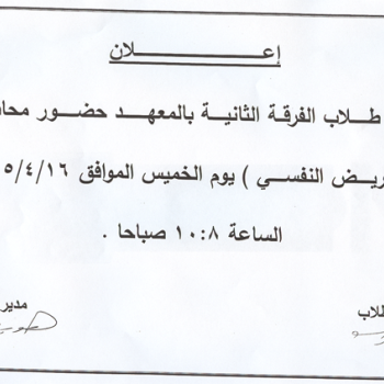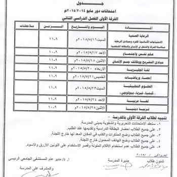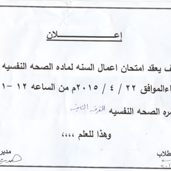 سوف يتم عقد امتحان الاختبار الاول فى مادة التمريض النفسىيوم السبت الموافق28/3/2015م الساعة الثامنة صباحا