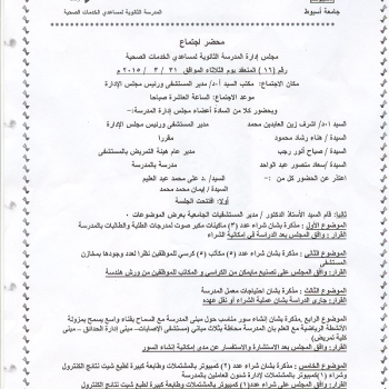 محضر اجتماع مجلس إدارة المدرسة الثانوية للتمريض لمساعدي الخدمات الصحية رقم (16) المنعقد يوم الثلاثاء الموافق 31/3/2015م.