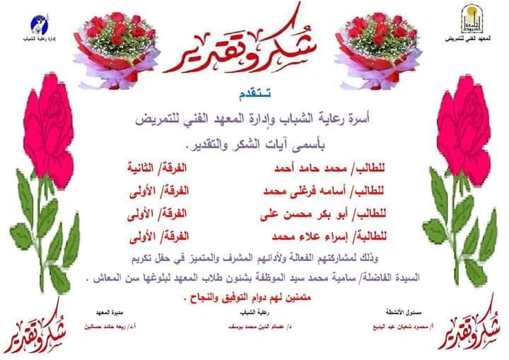 قالوا أن للنجاح والتقدم أناس يقدرون معناه وللإبداع أناس يحصدونه لذا نقدر جهودكم المضيئة فلكم منا كل الشكر والتقديرمن ربوع قلوبنا فنرسل أشعة من النور لتخترق جدار التميز والإبداع أشعة لامعة نرسلها لأصحاب التميز والإبداع. (ولسه الإبداع مستمر ).مع تمنيات أسره رعايه الشباب وإداره المعهد لهؤلاء الطلاب بدوام التوفيق والسداد .