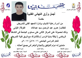 تهنئة لطالب على حصوله على المركز الثانى على مستوى الجامعة فى النشاط الرياضى 4 ديسمبر 2016 تهنئة لطالب على حصوله على المركز الثانى على مستوى الجامعة فى النشاط الرياضى