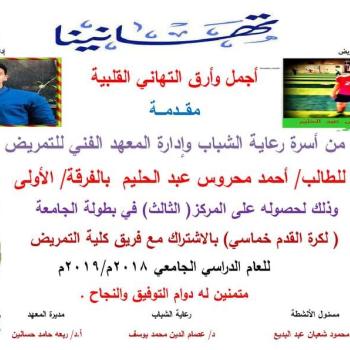 The Youth care family and the management of the Technical Institute of Nursing are in the name of thanks and appreciation The student Ahmed Mahrous Abdel Halim for the third place in the…