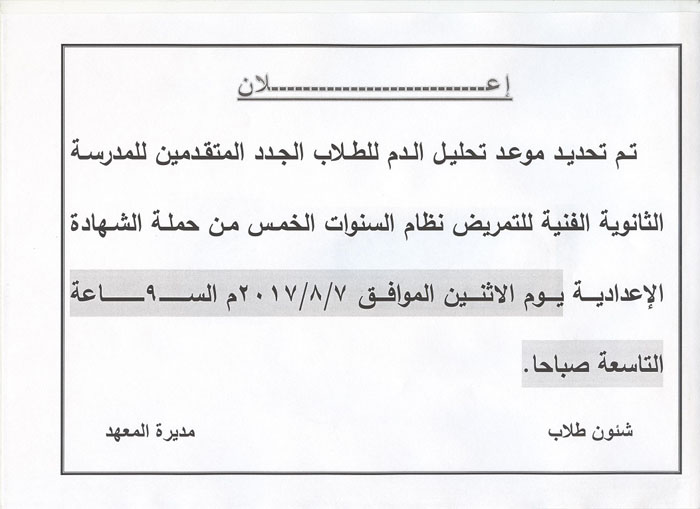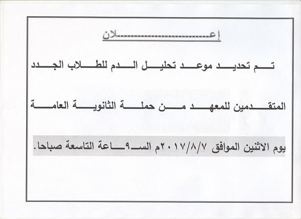Date of blood analysis for the new students applying for the technical Secondary School of nursing five year system Read more about Date of blood analysis for the new students applying for the technical Secondary School of nursing five year system Date of blood analysis for the new students applying for the technical Secondary School of nursing five year system 19 September 2017