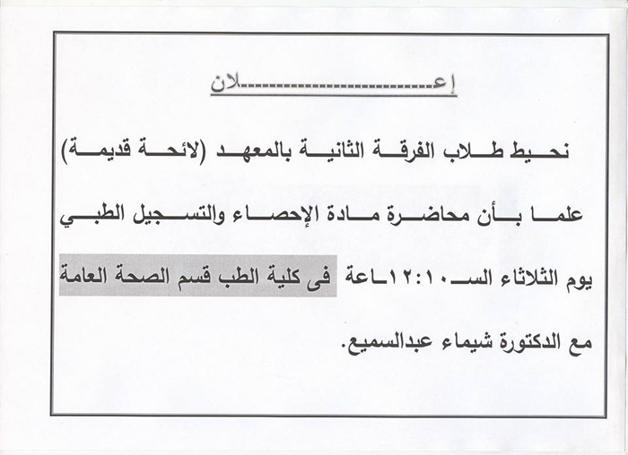 The students of the Second year of the Institute wirh a list of old groups (women and children) must present on Sunday at 8:00 a.m. at the Institute's lab, for a women's lecture with Ms. Rania.