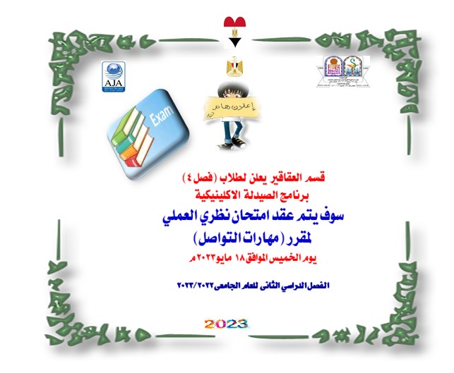 (amendment)The Department of Pharmacognosy announces to students (Semester 4) of the Clinical Pharmacy Program the practical sheet exam will be held for the (Communication Skills) course on Thursday, May 18, 2023