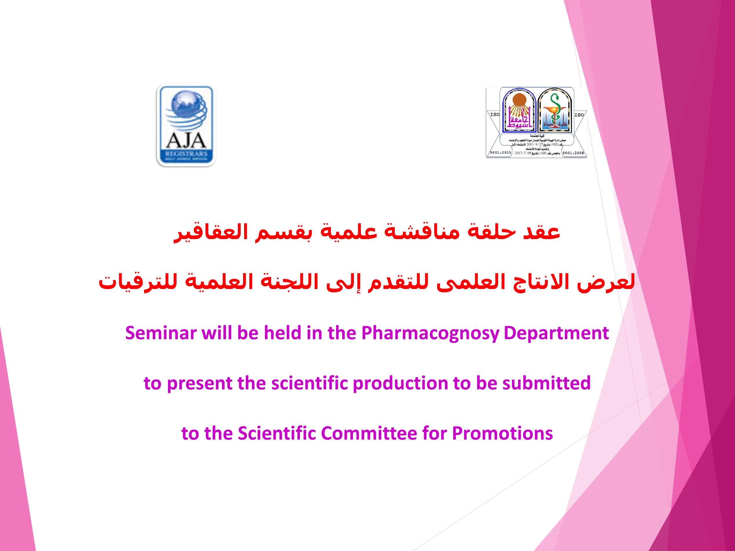 God willing, seminar will be held in the Pharmacognosy Department to present the scientific production to be submitted to the Scientific Committee for Promotions (assistant professors) for each of :-