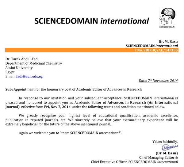 تم اختيار الأستاذ الدكتور/ طارق أبو الفضل محمد – الأستاذ بقسم الكيمياء الطبية ووكيل الكلية لشئون التعليم والطلاب - كعضو هيئة تحرير في المجلة الدولية Advances in Research والتي تصدرها SCIENCEDOMAIN international.