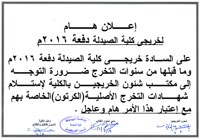 إعلان هام لخريجي كلية الصيدلة لاستلام الشهادات الأصلية. 8 نوفمبر 2016 إعلان هام لخريجي كلية الصيدلة لاستلام الشهادات الأصلية.