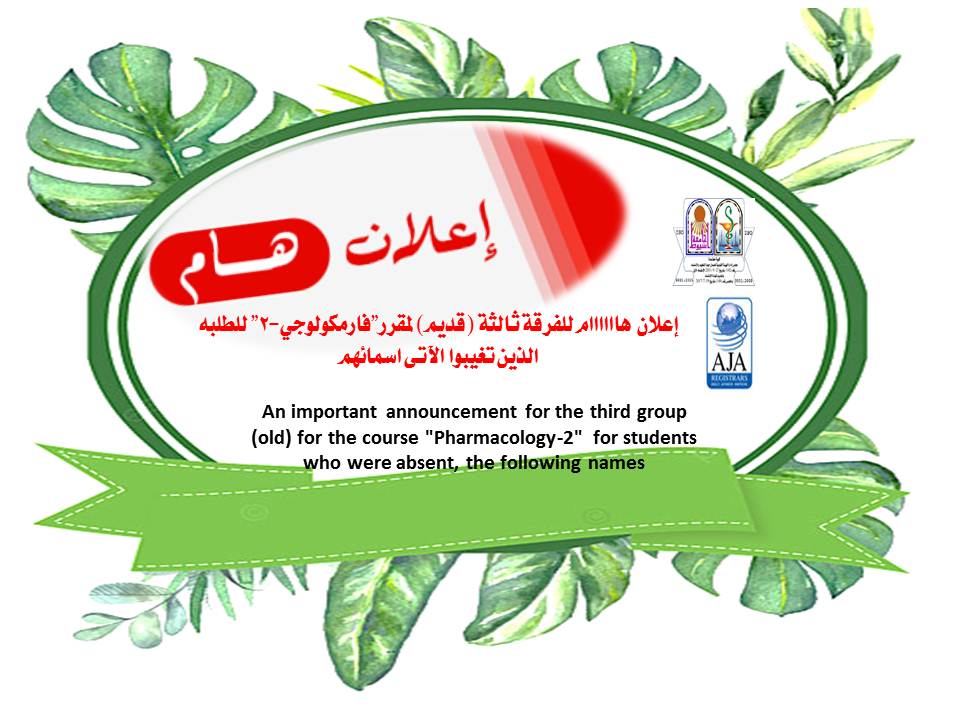 اعلان هام للفرقة ثالثة (قديم) قررعقد امتحان اعمال السنه لمقرر"فارمكولوجي-2" يوم الأثنين الموافق 23 مايو 2022 للطلبه الذين تغيبوا الآتى اسمائهم 9 مايو 2022
