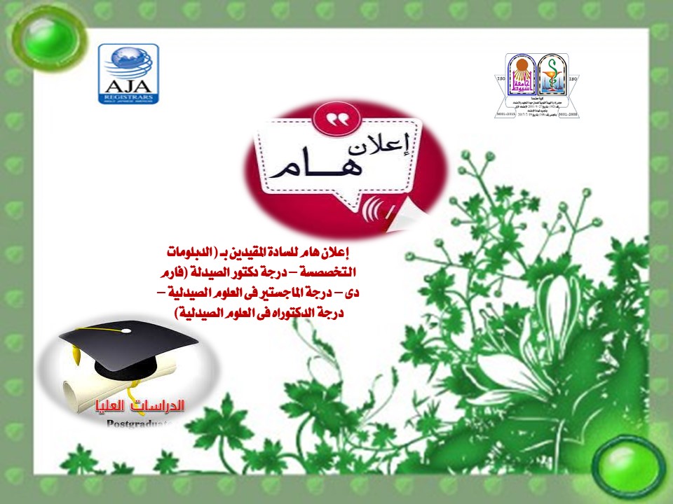 إعلان هام للسادة المقيدين بـ (الدبلومات التخصصية – درجة دكتور الصيدلة فارم دى – درجة الماجستير فى العلوم الصيدلية – درجة الدكتوراه فى العلوم الصيدلية) آخر موعد لتسجيل وسداد رسوم المقررات للفصل الدراسي الثانى هو 15 مايو 2022م