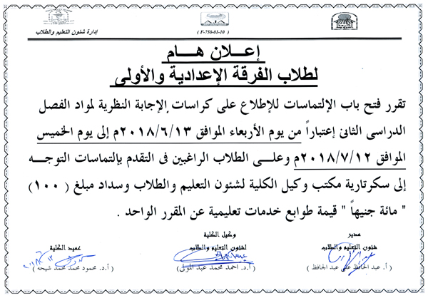 إعلان هام لطلاب الفرقة الإعدادية والأولي .. عن فتح باب الالتماسات للإطلاع علي كراسات الإجابة النظرية لمواد الفصل الدراسي الثاني. 20 يونيو 2018 إعلان هام لطلاب الفرقة الإعدادية والأولي .. عن فتح باب الالتماسات للإطلاع علي كراسات الإجابة النظرية لمواد الفصل الدراسي الثاني.