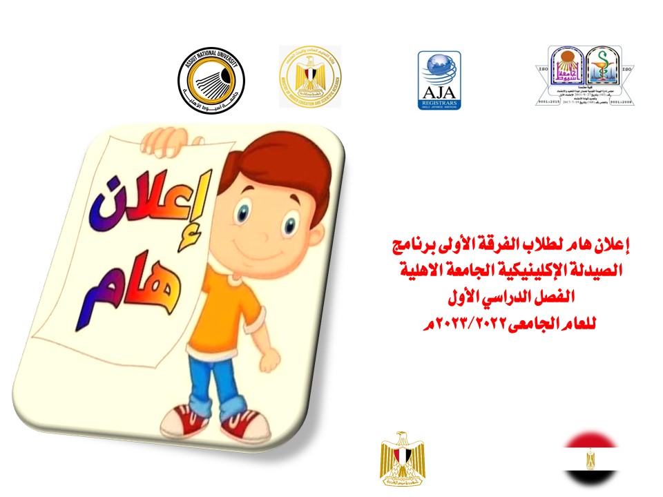 إعلان هام لطلاب الفرقة الأولى برنامج الصيدلة الإكلينيكية الجامعة الاهلية الفصل الدراسي الأول للعام الجامعى 2023/2022م 11 أكتوبر 2022