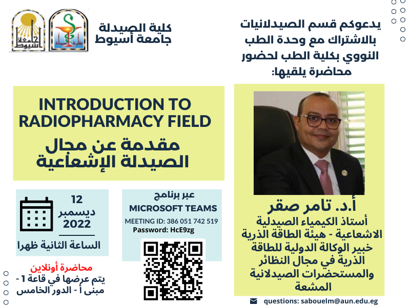 ندعوكم لحضور محاضرة اون لاين عن مجال الصيدلة الإشعاعية يلقيها