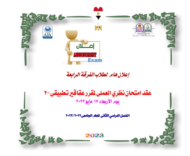 إعلان هام لطلاب الفرقة الرابعة سوف يتم عقد امتحان نظري العملى لمقرر عقاقير تطبيقى-2 يوم الأربعاء 17 مايو 2023 15 مايو 2023