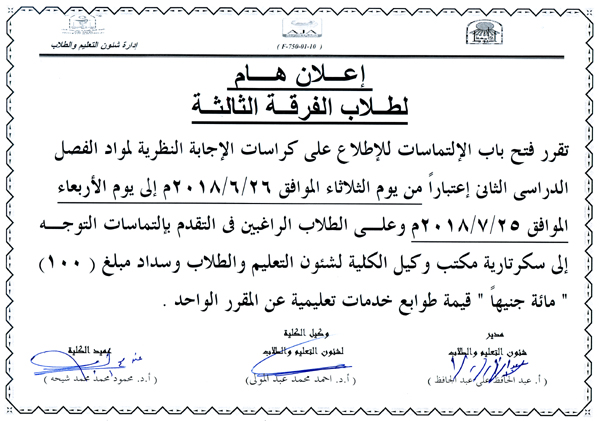 إعلان هام لطلاب الفرقة الثالثة .. فتح باب الالتماسات للإطلاع علي كراسات الإجابة النظرية لمواد الفصل الدراسي الثاني من العام الجامعي 2017-2018م. 3 يوليو 2018 إعلان هام لطلاب الفرقة الثالثة .. فتح باب الالتماسات للإطلاع علي كراسات الإجابة النظرية لمواد الفصل الدراسي الثاني من العام الجامعي 2017-2018م.