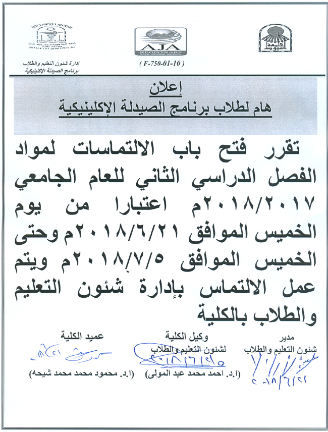 إعلان هام لطلاب برنامج الصيدلة الإكلينيكية .. عن فتح باب الالتماسات للإطلاع علي كراسات الإجابة النظرية لمواد الفصل الدراسي الثاني. 24 يونيو 2018 إعلان هام لطلاب برنامج الصيدلة الإكلينيكية .. عن فتح باب الالتماسات للإطلاع علي كراسات الإجابة النظرية لمواد الفصل الدراسي الثاني.