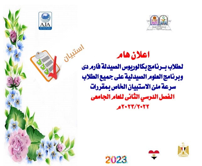 اعلان هام لطلاب بــرنامج بكالوريوس الصيدلة فارم دى وبرنامج العلوم الصيدلية على جميع الطلاب سرعة ملئ الاستبيان الخاص بمقررات الفصل الدرسي الثانى للعام الجامعى 2023/2022م