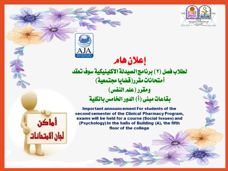 إعلان هام لطلاب فصل (2) برنامج الصيدلة الاكلينيكية سوف تعقد أمتحانات مقرر(قضايا مجتمعية) ومقرر (علم النفس) بقاعات مبنى (أ) الدور الخامس بالكلية 6 يونيو 2022