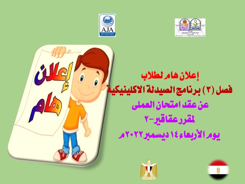 إعلان هام لطلاب فصل (3) برنامج الصيدلة الاكلينيكية عن عقد امتحان العملى لمقرر عقاقير-2 يوم الأربعاء 14 ديسمبر 2022م 12 ديسمبر 2022