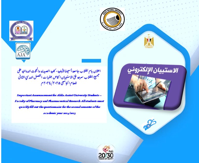 اعلان هام لطلاب جامعة أسيوط الأهلية- كلية الصيدلة والبحوث الدوائية على جميع الطلاب سرعة ملئ الاستبيان الخاص بمقررات الفصل الدرسي الثانى للعام الجامعى 2024/2025م