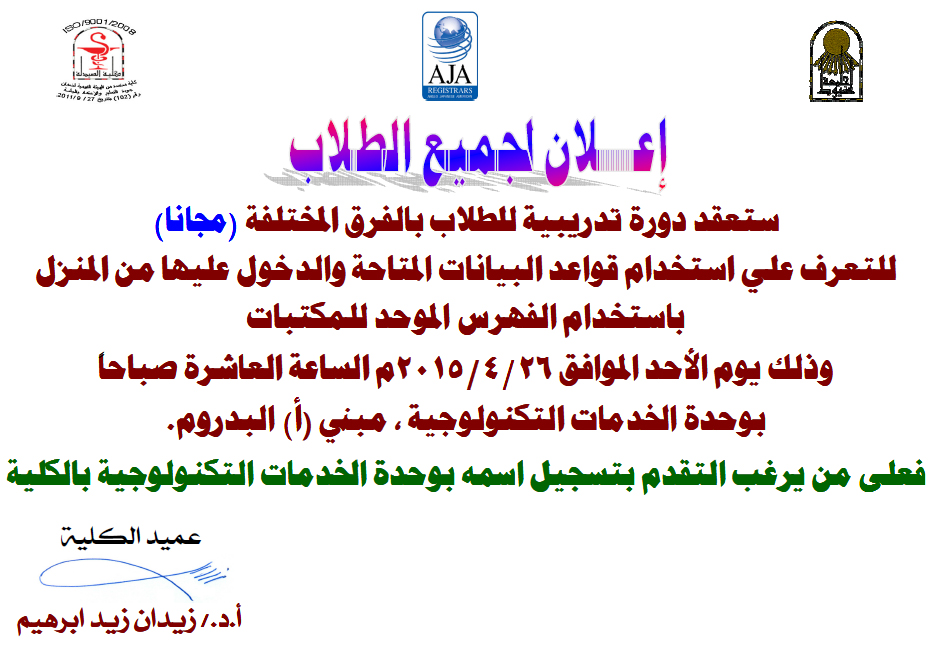 إعلان لجميع الطلاب (ستعقد دورة تدريبية للطلاب بالفرق المختلفة – مجاناً - للتعرف علي استخدام قواعد البيانات المتاحة والدخول عليها من المنزل باستخدام الفهرس الموحد للمكتبات).