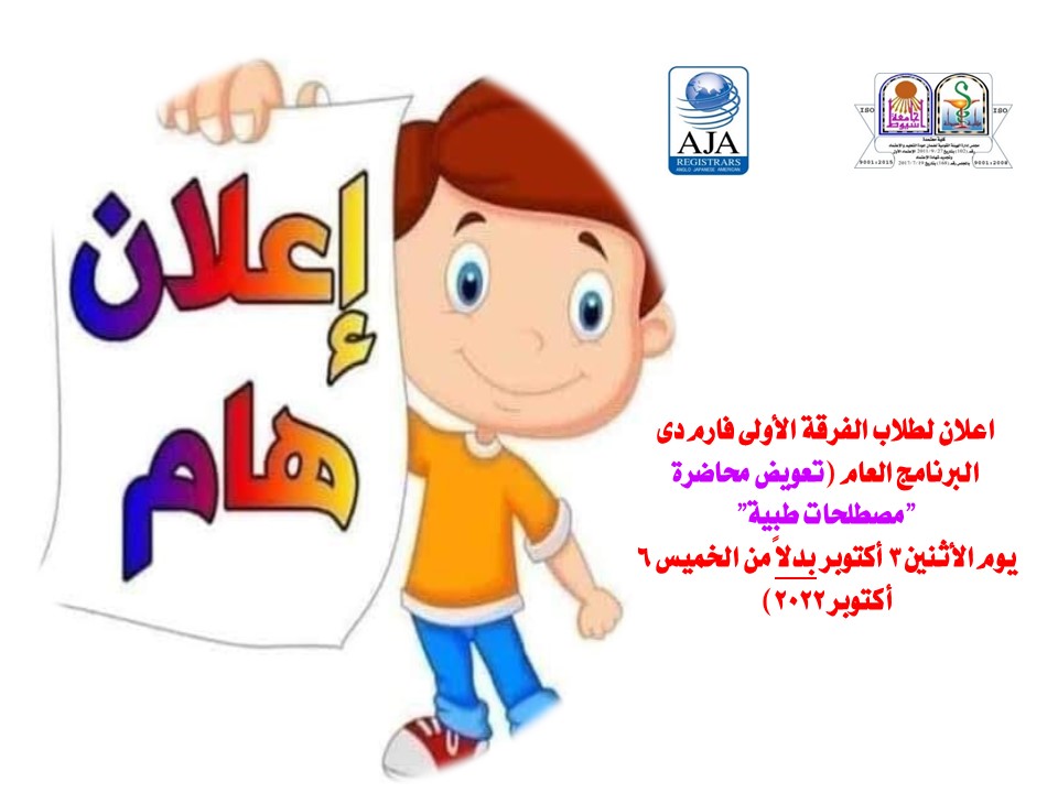 اعلان لطلاب الفرقة الأولى فارم دى البرنامج العام (تعويض محاضرة "مصطلحات طبية" يوم الأثنين 3 أكتوبر بدلاً من الخميس 6 أكتوبر 2022) 3 أكتوبر 2022
