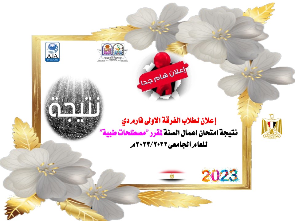 إعلان لطلاب الفرقة الاولى فارم دي نتيجة امتحان اعمال السنة لمقرر "مصطلحات طبية" للعام الجامعى 2023/2022م 12 يناير 2023 اضغط ? نتيجة أعمال سنة لمقرر " مصطلحات طيبة" للفرقة الأولى Pharm –D