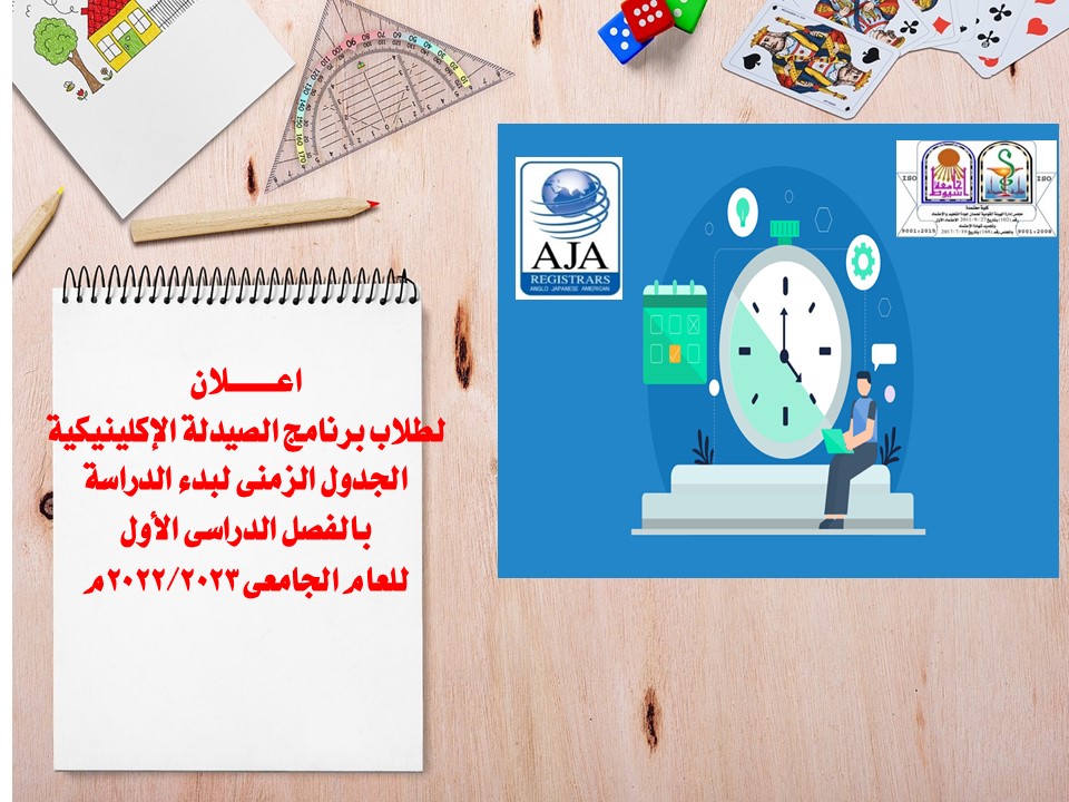اعـــــــلان لطلاب برنامج الصيدلة الإكلينيكية الجدول الزمنى لبدء الدراسة بالفصل الدراسى الأول للعام الجامعى 2023/2022م 29 سبتمبر 2022