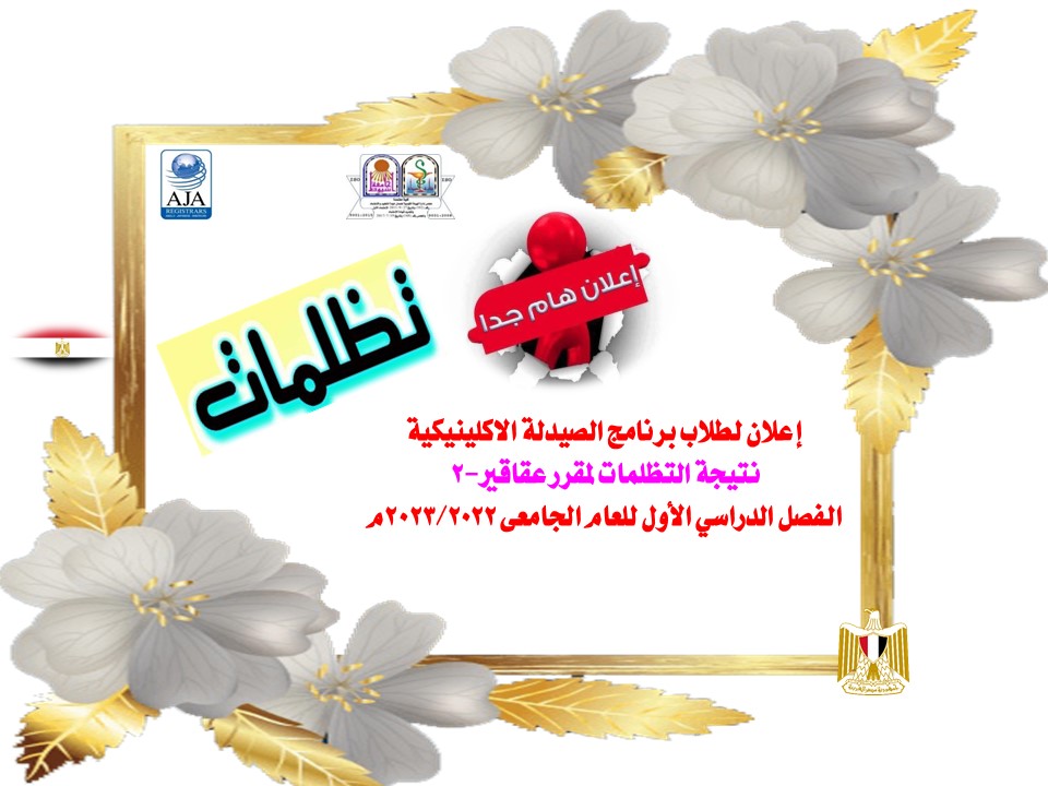 إعلان لطلاب برنامج الصيدلة الاكلينيكية نتيجة التظلمات لمقرر عقاقير-2 الفصل الدراسي الأول للعام الجامعى 2023/2022م 10 يناير 2023