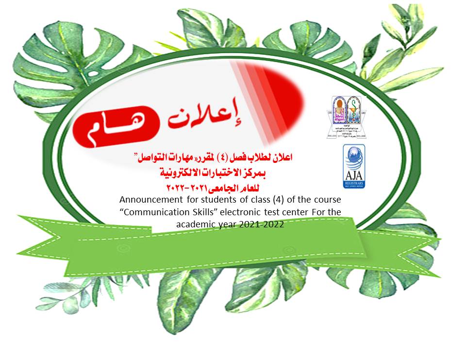 اعلان لطلاب فصل (4) برنامج الصيدلة الإكلينيكية يوم الأثنين الموافق 9 مايو 2022 لمقرر"مهارات التواصل" بمركز الاختبارات الساعة 2 بعد الظهر 6 مايو 2022 اضغط قائمة باسماء الطلاب لفصل (4) لمقرر"مهارات التواصل"