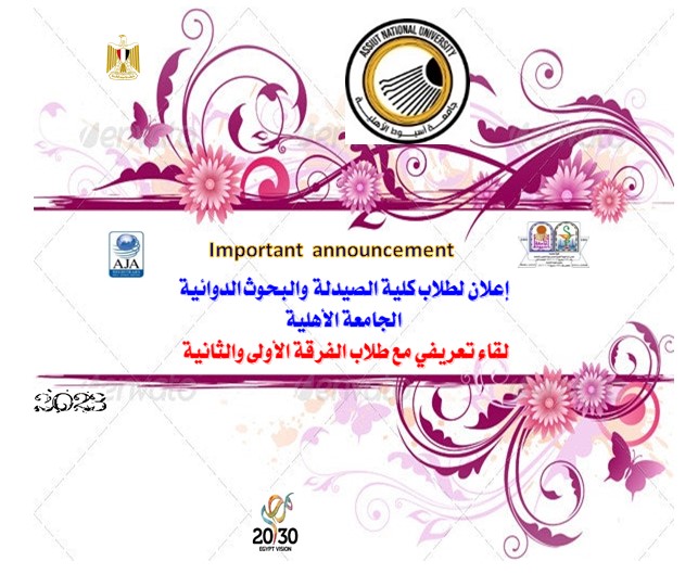إعلان لطلاب كلية الصيدلة والبحوث الدوائية الجامعة الأهلية لقاء تعريفي مع طلاب الفرقة الأولى والثانية 26 سبتمبر 2023