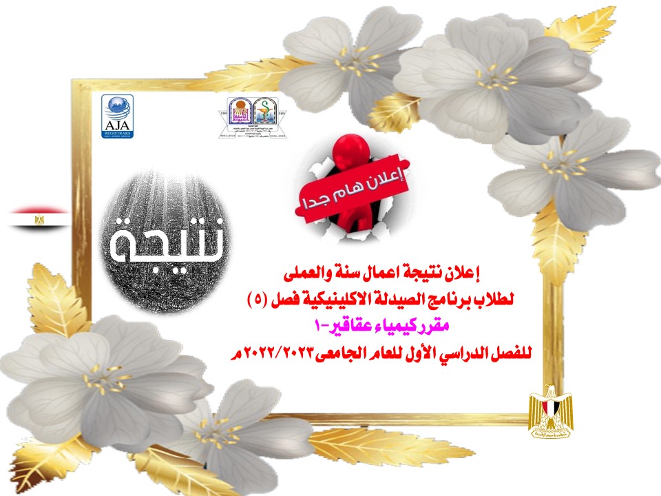 إعلان نتيجة اعمال سنة والعملى لطلاب برنامج الصيدلة الاكلينيكية فصل (5) مقرر كيمياء عقاقير-1 للفصل الدراسي الأول للعام الجامعى 2022/2023م 22 ديسمبر 2022 اضغط ? نتيجة أعمال سنة والعملي لمقرر كيمياء عقاقير -1فصل (5) برنامج الصيدلة الاكلينيكية