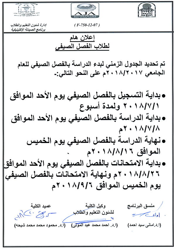 الجدول الزمني لبدء الدراسة بالفصل الصيفي للعام الجامعي 2017-2018م. 20 يونيو 2018 الجدول الزمني لبدء الدراسة بالفصل الصيفي للعام الجامعي 2017-2018م.