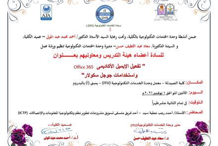 ورشة عمل بعنوان " تفعيل الإيميل الأكاديمى واستخدامات جوجل سكولار" للسادة أعضاء هيئة التدريس ومعاونيهم